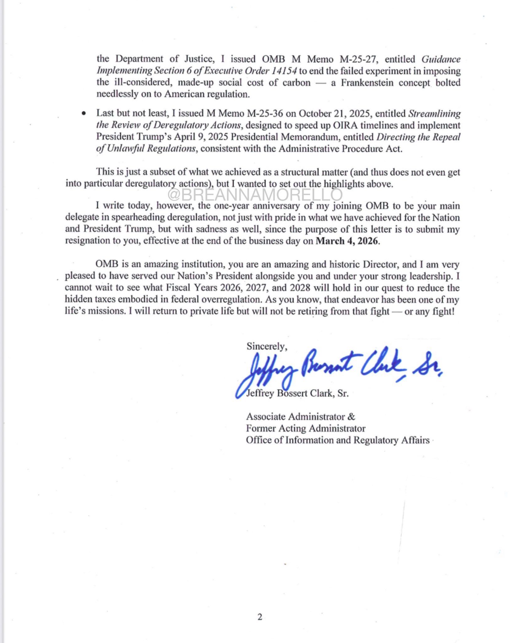 The White House has not yet commented publicly on the resignation or named a replacement for the OIRA leadership role. Clark's move follows his earlier public statements expressing gratitude for the opportunity to serve in the administration's deregulatory efforts.