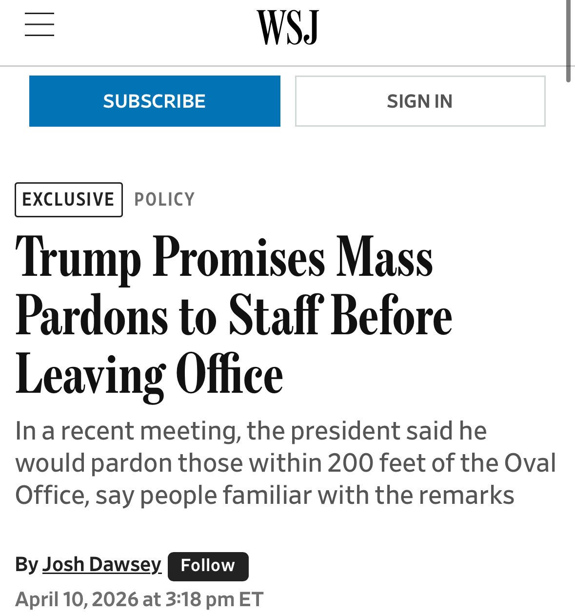 According to the WSJ, President Trump has made these comments on multiple occasions, including joking in a recent meeting that he would pardon anyone who had come within 200 feet of the Oval Office—and in one instance even within 10 feet. The article also noted a separate conversation in which he reportedly mentioned hosting a news conference to announce broad pardons. These remarks have reportedly surfaced amid concerns from some aides about potential investigations by Democrats following the election, and they come as the administration has already exercised clemency powers more extensively in the current term than during Trump's first presidency.